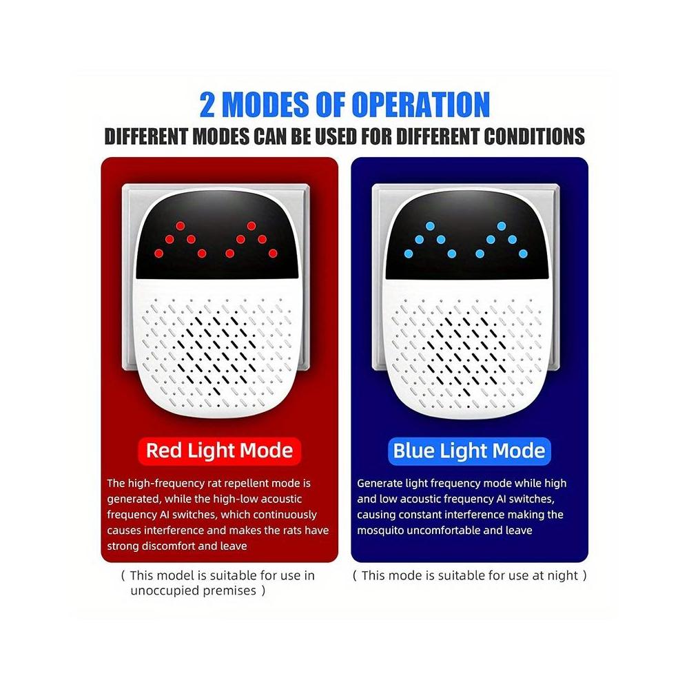– Λειτουργία με κόκκινο φως (Red Light Mode): Μια ισχυρή λειτουργία ακουστικών παλμών που αντηχεί στα ακουστικά συστήματα των τρωκτικών (ποντίκια, αρουραίοι), προκαλώντας τους δυσφορία και αναγκάζοντάς τα να απομακρυνθούν.