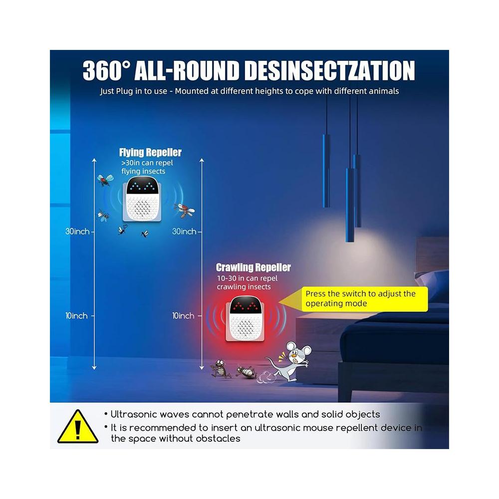 – Λειτουργία με μπλε φως (Blue Light Mode): Πρόκειται για μια «έξυπνη» αθόρυβη λειτουργία υπερήχων, σχεδιασμένη κυρίως για την απώθηση εντόμων όπως κουνούπια, κατσαρίδες, μύγες και μυρμήγκια.