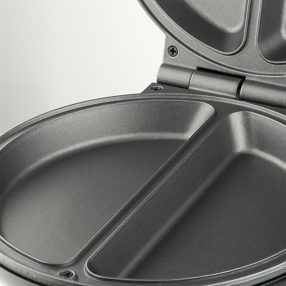 Διαθέτει αντικολλητική επιφάνεια με 2 ξεχωριστά τμήματα έτσι ώστε να φτιάχνετε ταυτόχρονα 2 ομελέτες. Επιπλέον, έχει μια φωτεινή ένδειξη που ενημερώνει ότι η ομελέτα είναι έτοιμη για σερβίρισμα.