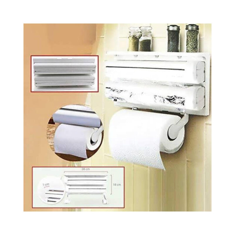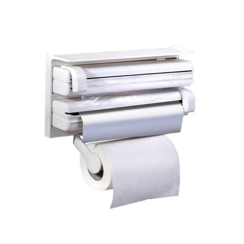 Εύχρηστη πολυθήκη κουζίνας στην οποία μπορείτε να βάλετε την μεμβράνη περιτυλίγματος, το αλουμινόχαρτο και το χαρτί ρολό κουζίνας και να τα κόβετε εύκολα και απλά οποιαδήποτε στιγμή.